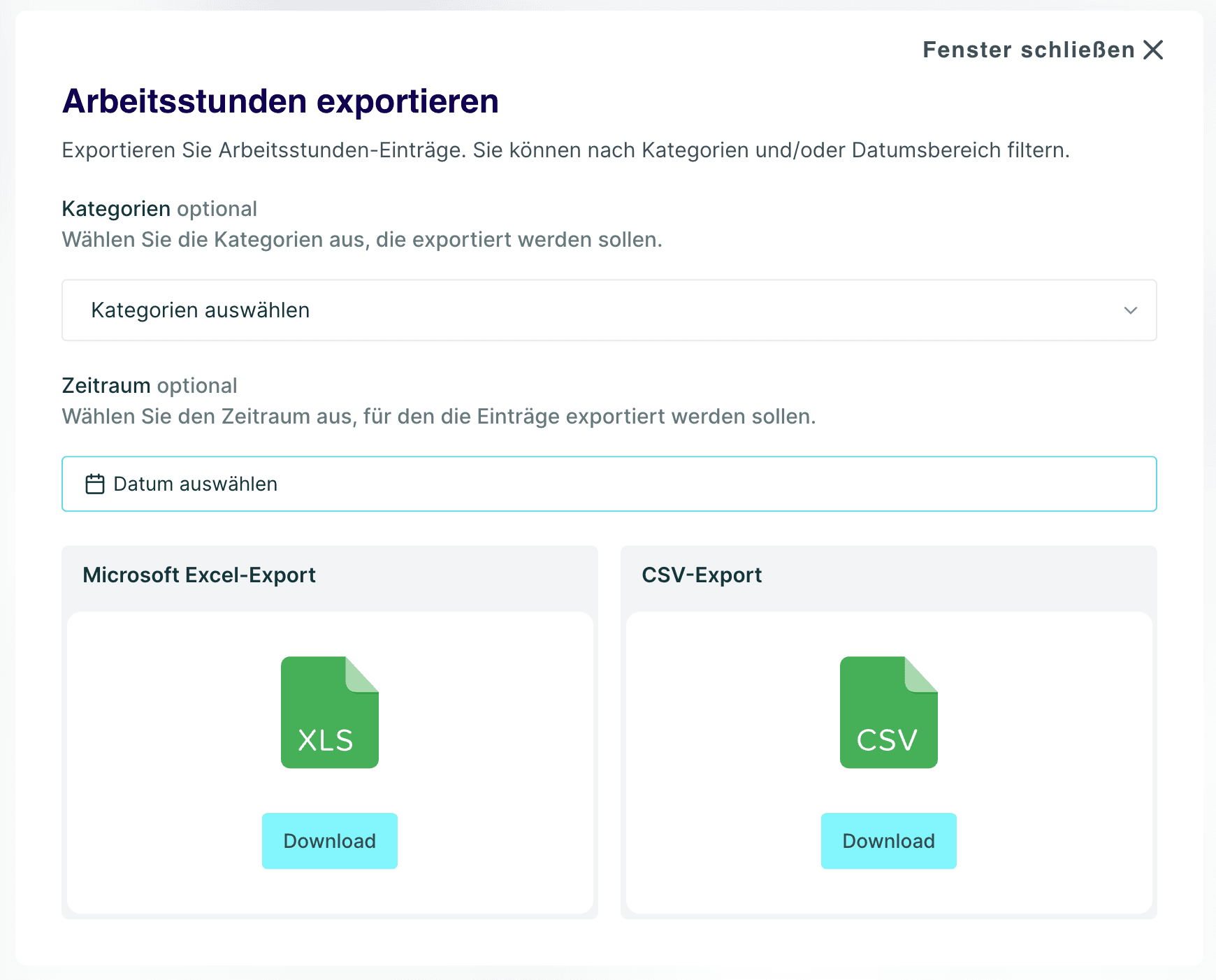 Der CSV-Export für die Arbeitsdienststunden wurde umfassend optimiert. Ab sofort können mehrere Kategorien gleichzeitig exportiert und der Exportzeitraum gezielt gefiltert werden. Zudem lässt sich das gewünschte Dateiformat direkt auswählen (Excel oder CSV).